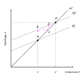 erkennt man, dass sich das Volkseinkommen durch die erhöhten staatlichen Ausgaben nicht nur um 600.000 CHF erhöht, sondern um 1/(1-c1)*600.000 CHF, also ein vielfaches davon. Das liegt daran, dass all das Geld, das für die Reparaturen ausgegeben wird zuerst als Einkommen an die Handwerker usw. fliesst, diese damit Waren kaufen, die Produktion angekurbelt wird, dadurch wieder mehr Löhne ausgezahlt werden und wieder mehr gekauft wird. Der Effekt entfaltet sich so über mehrere Lohnrunden. So gesehen hat die Demonstration von Bern nicht nur das Einkommen der Glasereien, sondern von allen Schweizer*innen erhöht.